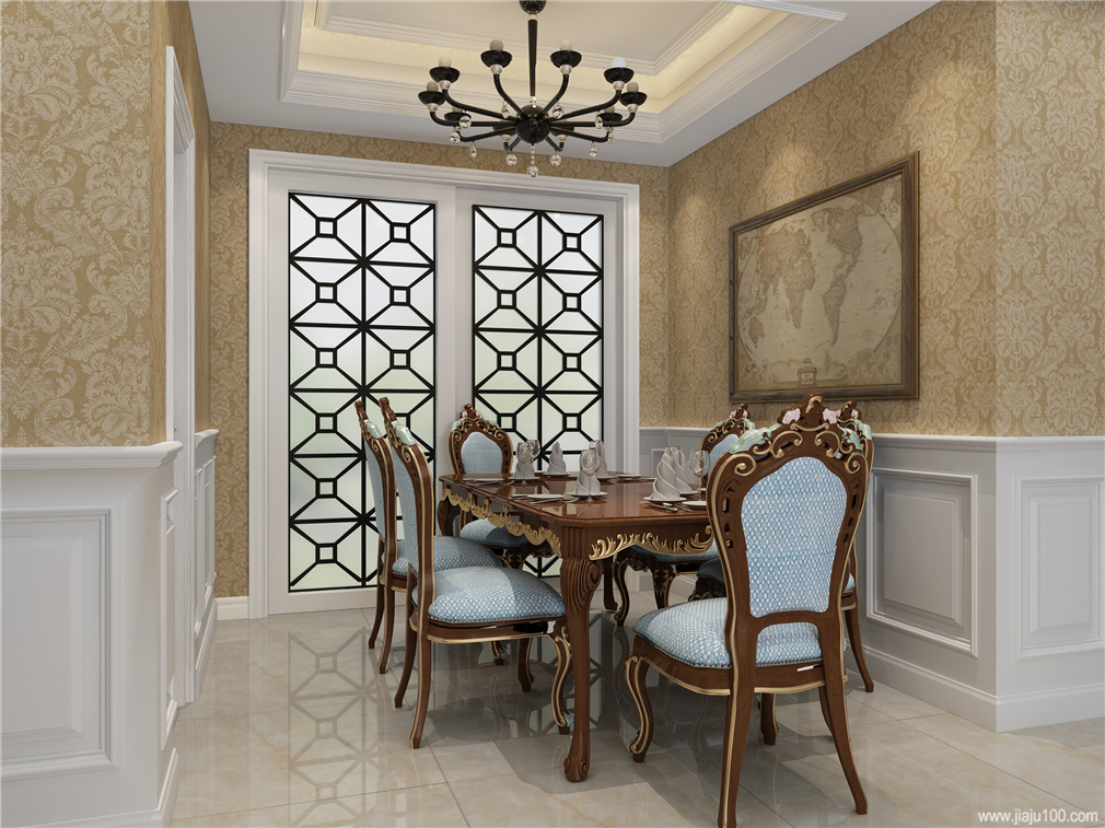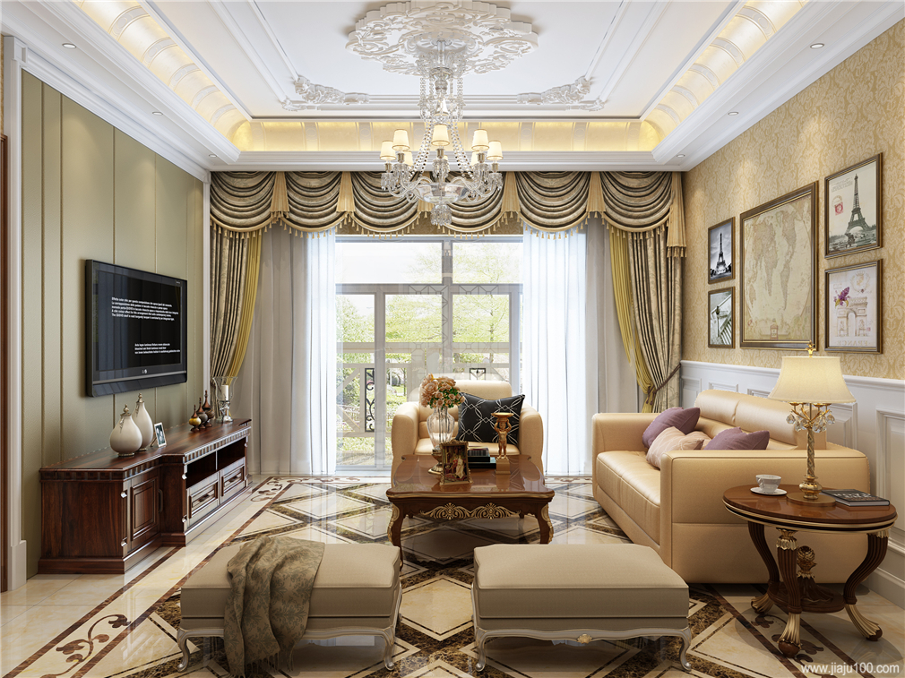 弧线、雕刻、描金等都是欧式风格常见的元素。户型面积约170平米,比较宽敞,通过色彩对比、家具摆放技巧来体现豪华大气。