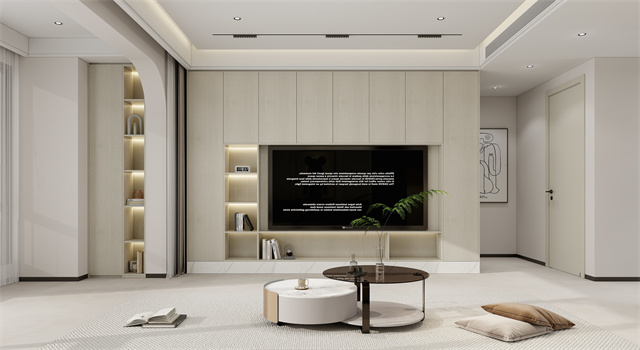 悬浮式视听墙:电视嵌入墙体,下方做20cm悬空抽屉柜,视觉上“减轻”柜体重量