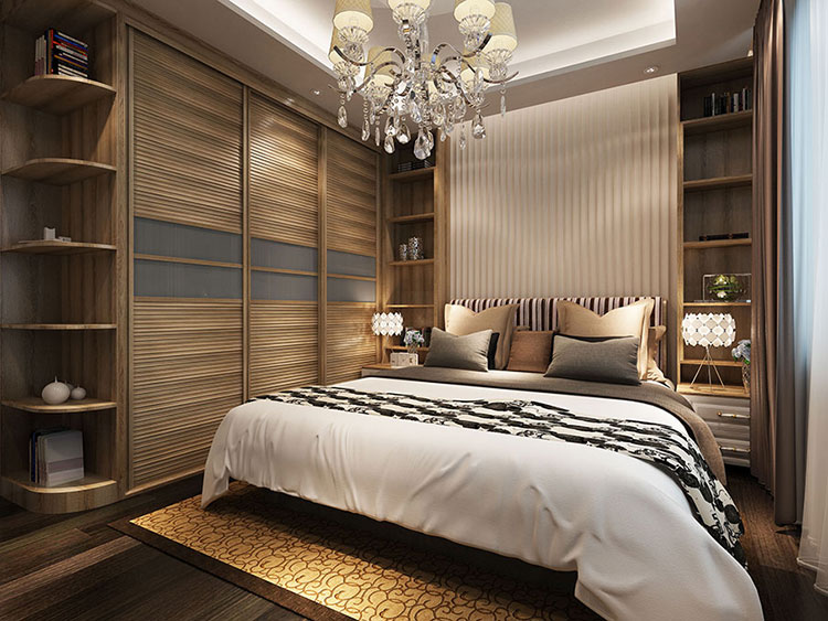 造型简单,色调温馨,平板夹百叶的设计在单调中增添了线条的美感。顶柜设计可以收纳不常用衣物或过季衣物,展示柜的圆弧设计尽显贴心,是非常人性化的设计。