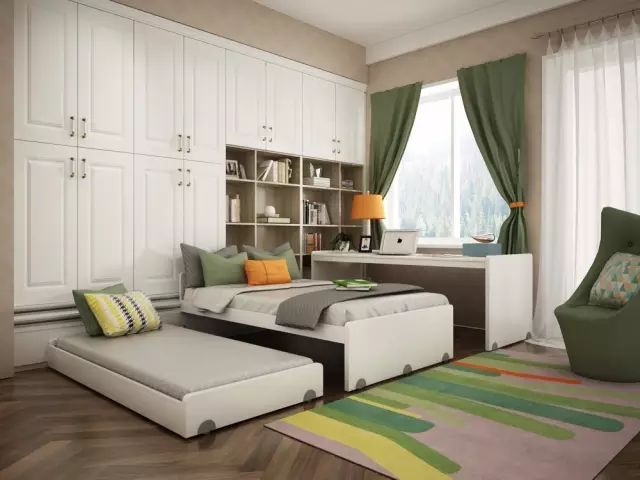 活动桌就是自己的工作台,滑动床是自己的床,活动床“藏”在滑动床下面,就算有闺蜜或好基友“临时突击”,照样有他们的落脚之地,避免挤在一张床上的尴尬。把滑动床、滑动桌、活动床“叠罗汉”,就腾出很大的活动区,女生练瑜伽,男生练肌肉,生活岂不美哉。