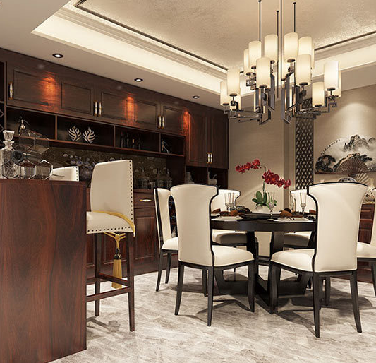 特色:酒是中国的传统文化,经典红檀木色的四方吧台与酒柜组合,加入现代化元素,很有文化意蕴,酒柜同时与餐边柜是一体,增加多功能实用性。
