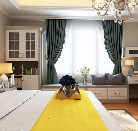 1、飘窗改造是利用卧室凹凸位空间,设计柜体,增加可利用空间。