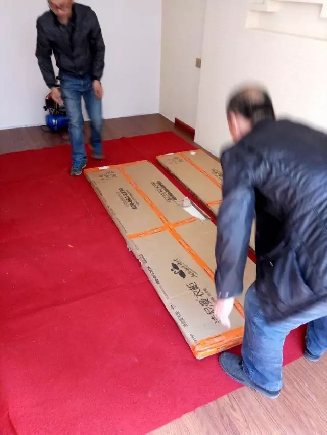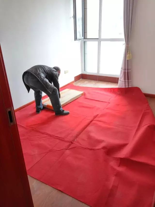 安装前师傅会先铺上一块红地毯,这样可以保护业主家的地板不被弄脏和刮花,同时也是保护定制衣柜的板材不被刮花,服务细节非常人性化和贴心。
