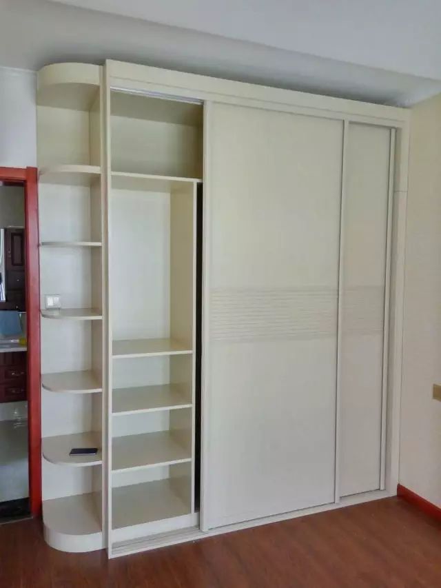 这款是到顶的推拉门定制衣柜,把门向右推拉,看到衣柜内部的层板,也就是叠放区,可分类叠放不同的衣服。外侧是开放式的圆弧侧柜,可放装饰品、包包等,充当展示区和临时存放区。
