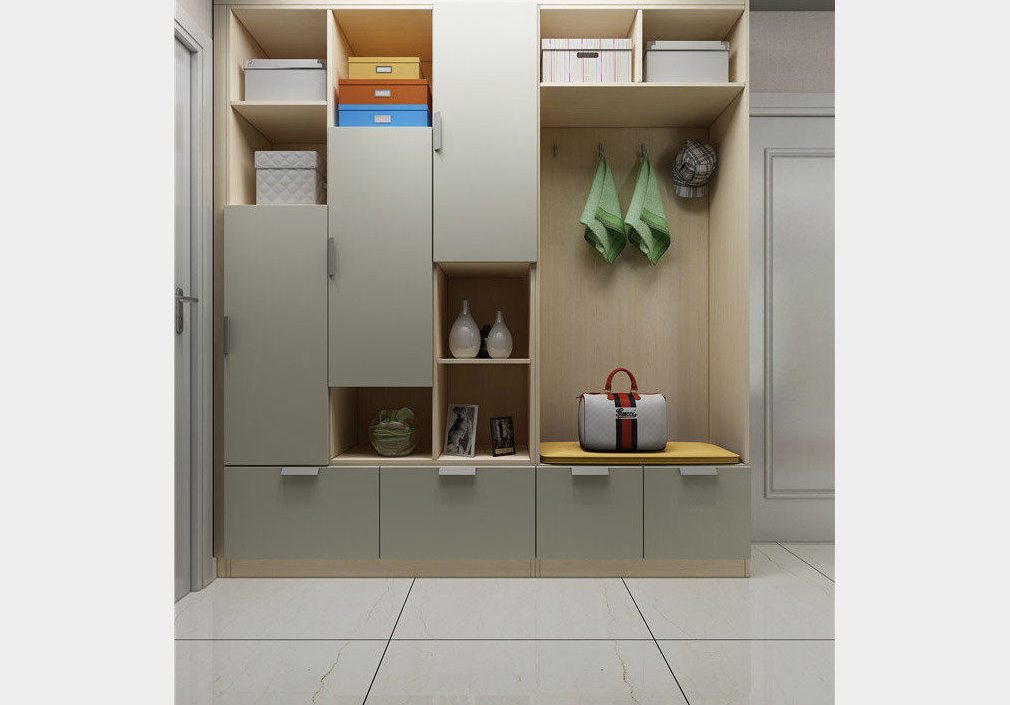 诗尼曼转角玄关鞋柜设计,利用挂钩和开放侧柜能实现多种物品收纳功能,拿取物品非常的便捷。可以结合餐厅定制家具一起设计,如转角玄关与餐厅收纳柜组合。