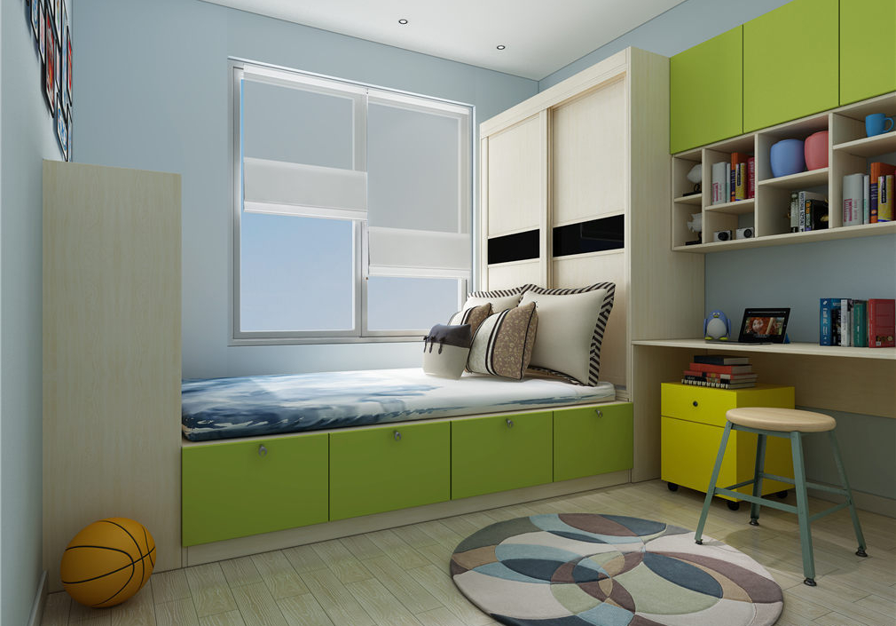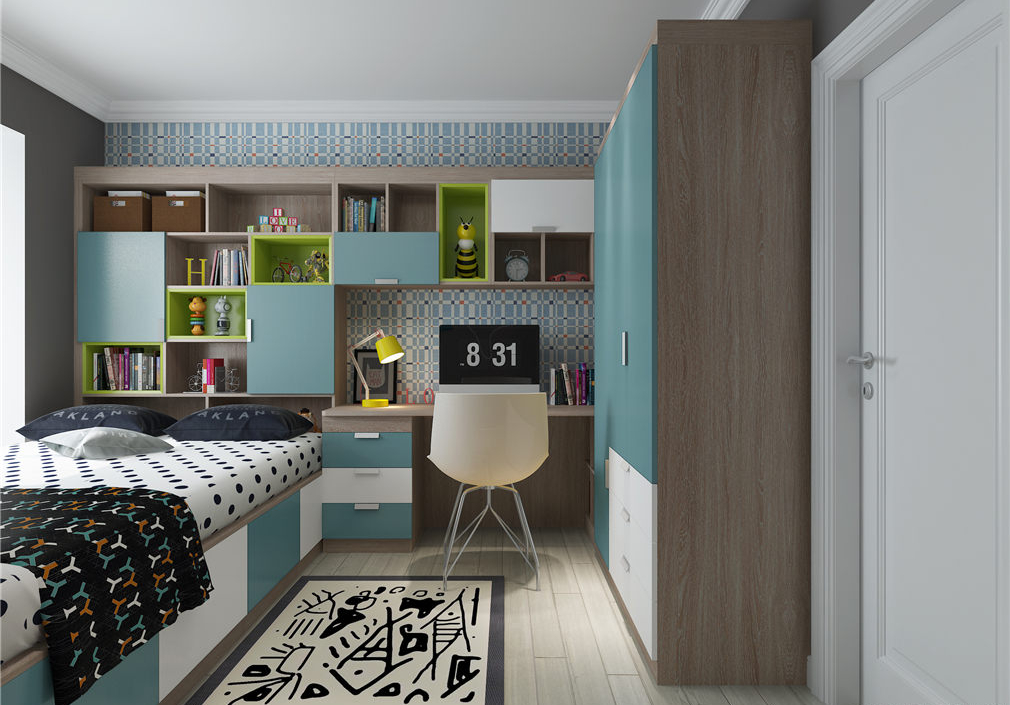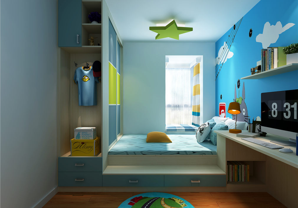 儿童房家具用了多功能榻榻米,与衣柜和书桌柜一体化,有高低错落的层次感,增大储物空间。