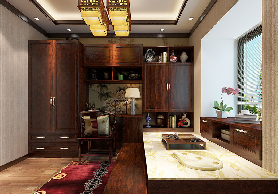 在书房书桌结合定制衣柜的形式也不少见,如果您划分一个空间作为书房,但您的书籍也不是特别多的时候,那就挪出点位置定制衣柜吧,毕竟现在的家庭需求还是以储物为主,进门处设计到顶的衣柜,有效的增加了储物空间,转动90度角后就链接了书柜的形式,开放与半开放结合的形式,让常用书籍和不常用书籍都有更好的方式摆放,靠近推拉门的位置设计为书桌,采光性非常充足,这样的书房还有谁不喜欢呢。