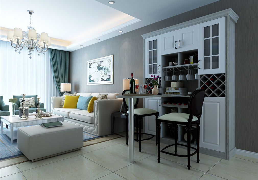 简欧风格客餐厅,空间较大,搭配得体的家具能营造典雅高贵的氛围。柜子用了吸塑工艺,从线条勾勒上看出品位。在客厅沙发一侧设计了吧台,提倡一种精致的生活方式。