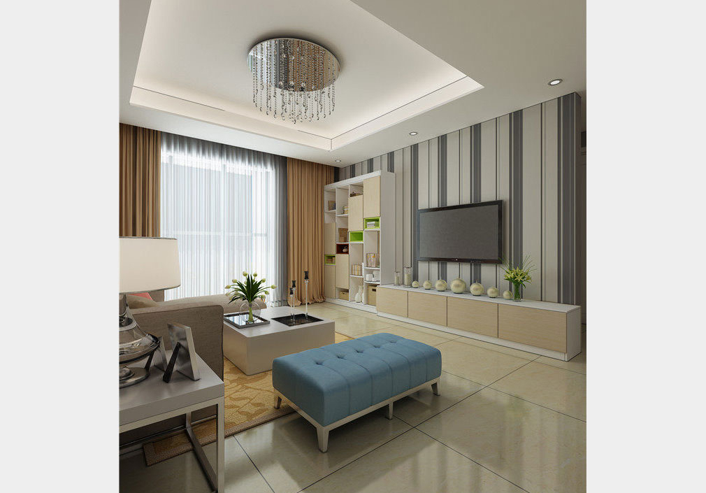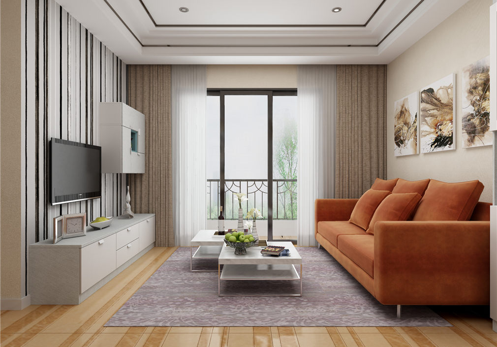 该户型较小,客厅采用一字电视柜,省去多余装饰,电视柜背景墙用竖条纹拉伸空间,让空间看起来更大。橙色普拉达沙发和水晶粉色餐椅起到了局部提亮效果,使整个空间的设计时尚而舒适。