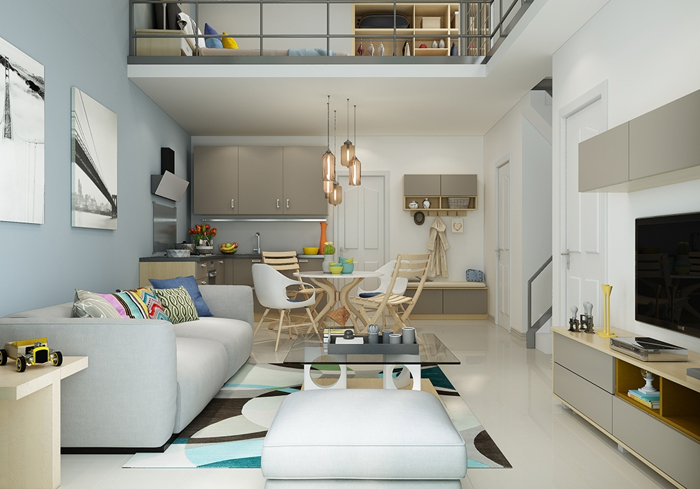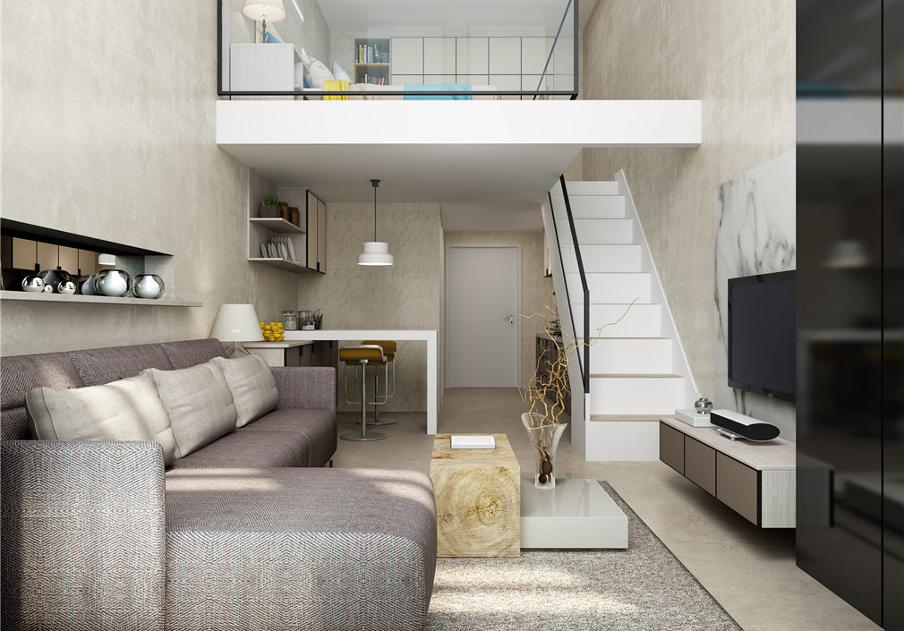 复式公寓户型一般比较迷你,也更讲究功能区的布局。楼梯下的不规则空间用定制家具能提高利用率。餐厅采用吧台形式,更随意而有现代感。极简主义款式的麻布沙发,搭配造型简约的电视柜,舒适实用。