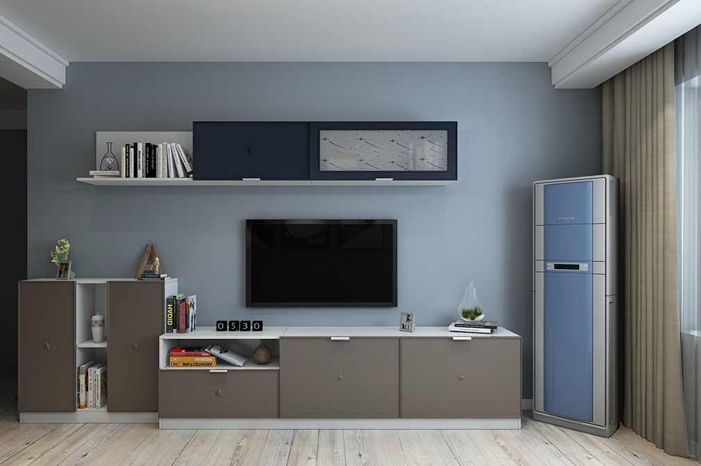 该客餐厅整体色调营造的是色彩丰富的现代简约风格。餐厅水湖蓝门板加入星光系列设计,给人一种时尚感,储物功能较大,方便就餐用品的摆放。客厅电视柜门板主要以绅士灰和穿越蓝红为主色,使整个空间显得很有格调。