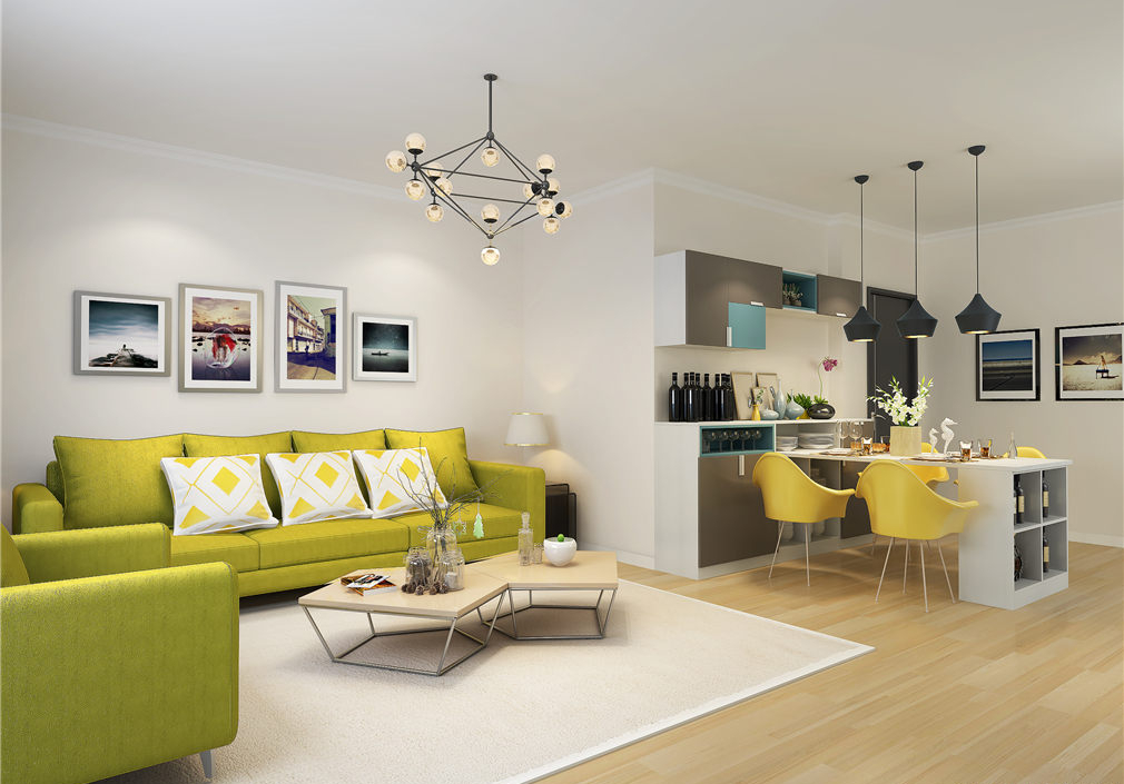 客餐厅的布局简单,充满现代感。入门处的鞋柜由上下两组柜子组成,好用美观。开放式厨房的橱柜也是餐边柜。客厅摆放柔软简约的沙发,电视柜由地柜和吊柜组成,置物架用宫廷黄点缀,朴素中带点活泼俏皮的意味。