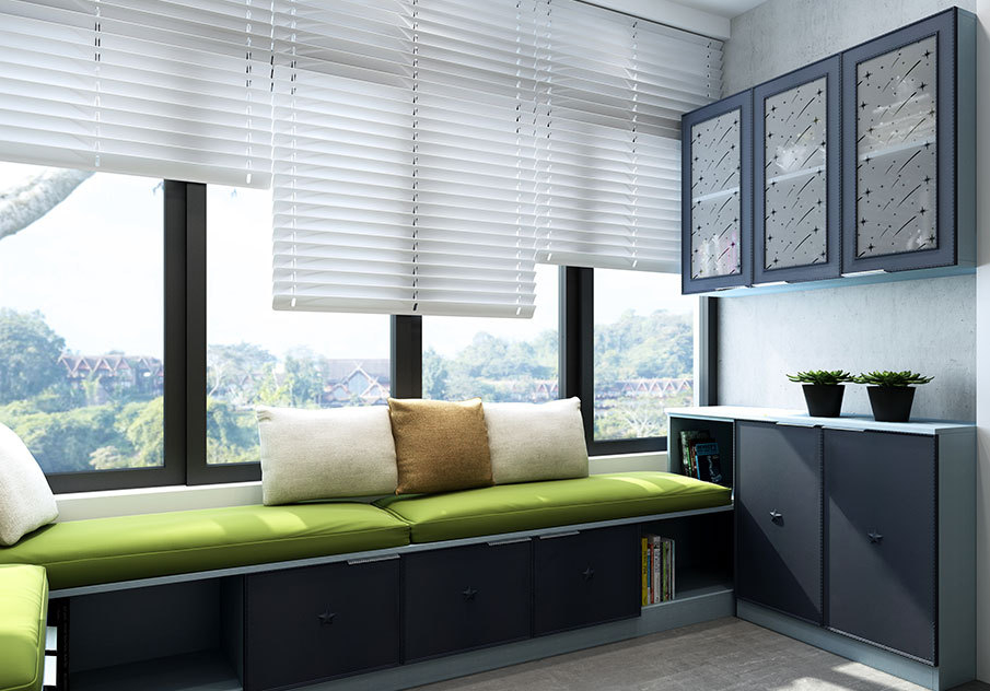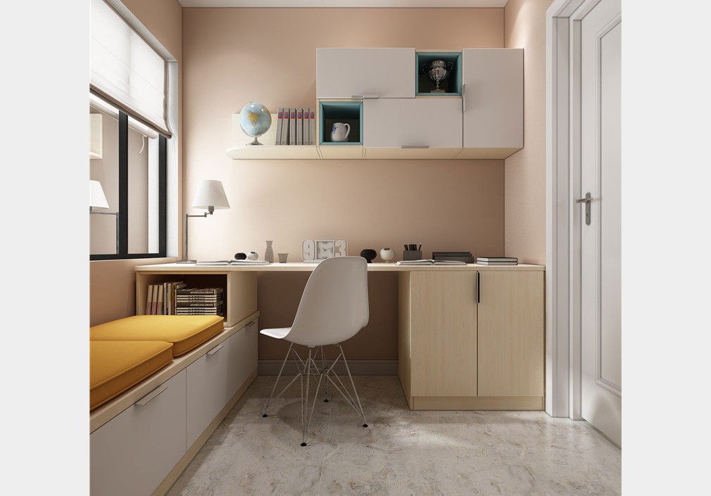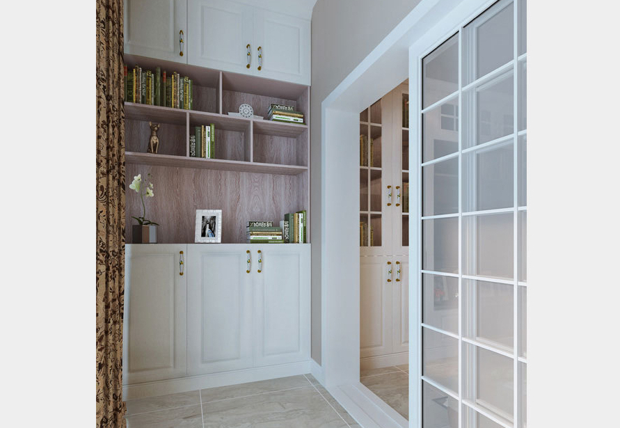 那么,除了洗衣柜,阳台还能怎么玩?阳台设计成飘窗+书柜+吊柜组合,一个小小的阅读空间就出来。书桌+吊柜满足阅读跟存书的功能,窗外阳光就是最便宜的灯光,若是怕阳光太刺眼,还可以在窗户处增加纱质窗帘。飘窗内部强大储物空间,收纳家里杂物,保持空间整洁。