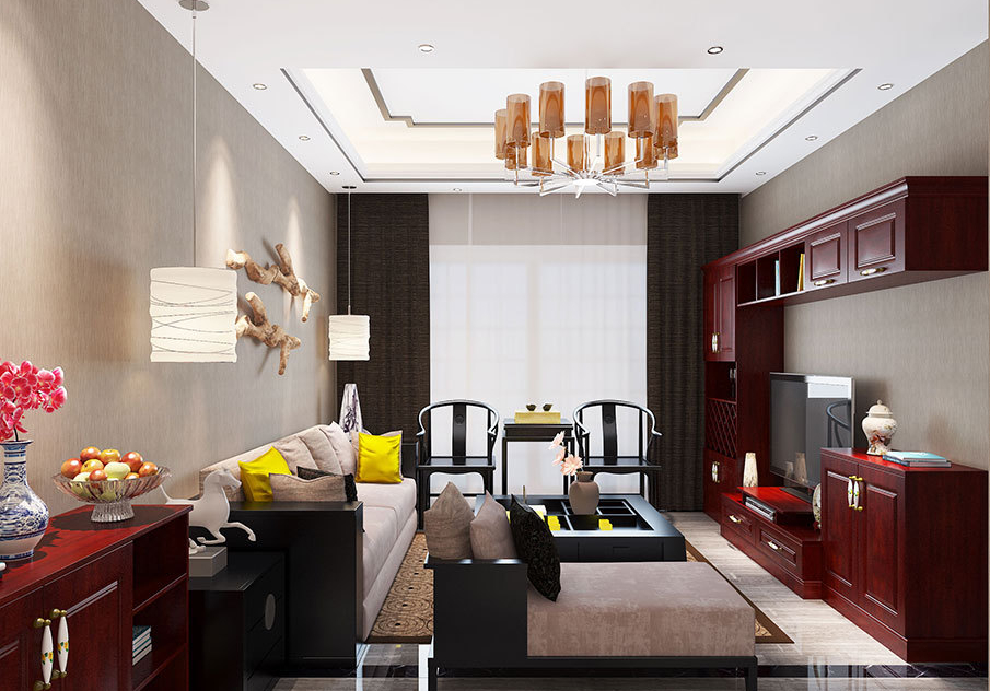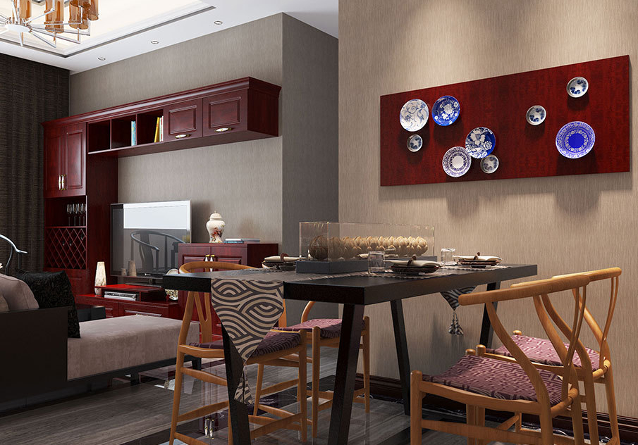 中式风格在色调上常用有代表性的中国红,苹果木恰能营造这种氛围。茶具,圈椅,瓷器,都是中式风格家居常出现的元素,体现深厚的文化底蕴。电视组合柜用了独具古典韵味的色调,分成大小不同的收纳柜,同时融入菱形酒格,在满足视听区收纳需求的同时,也能服务用餐区,整个空间呈现出沉稳大气之风。