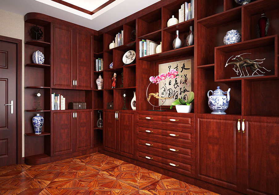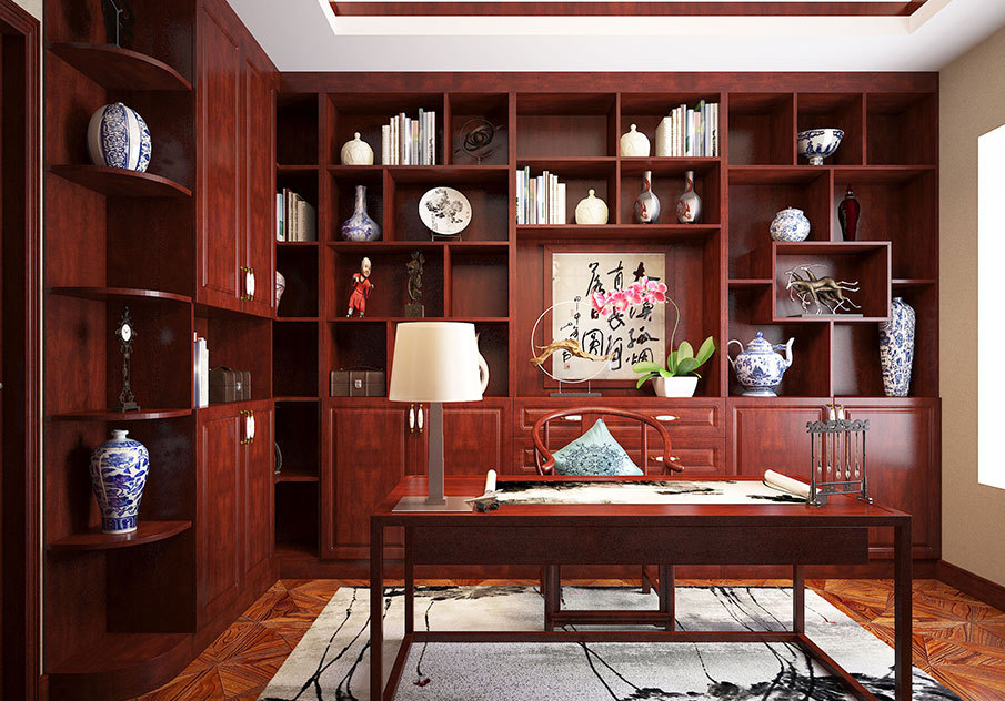 书柜大气古典,不同大小的收纳格子,开放区与闭合区兼有,侧边做了圆弧形的处理,可收纳可展示,与书桌、椅子风格一致,让整个书房都弥漫出浓厚的文化气息。