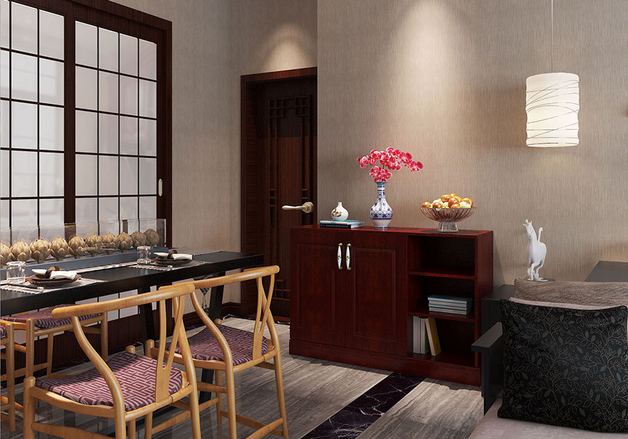 餐桌柜延续客餐厅的整体风格,苹果木制作。掩门设计,增加收纳空间,可以收纳更多杂物。一边留作开放式设计,摆上书籍,古玩之物装饰,文化气息浓厚。