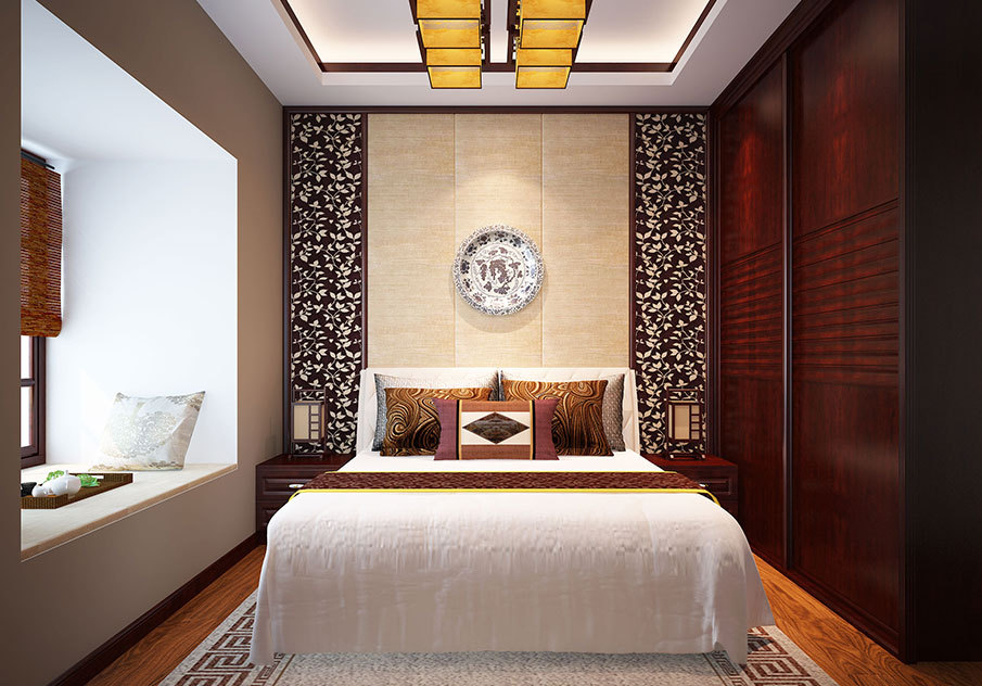 卧房在细节上注重体现中式风格特点,床头背景墙的处理和床头灯的造型,都是有心的特别设计。家具用了优雅古典的苹果木色调,温润有质感。
