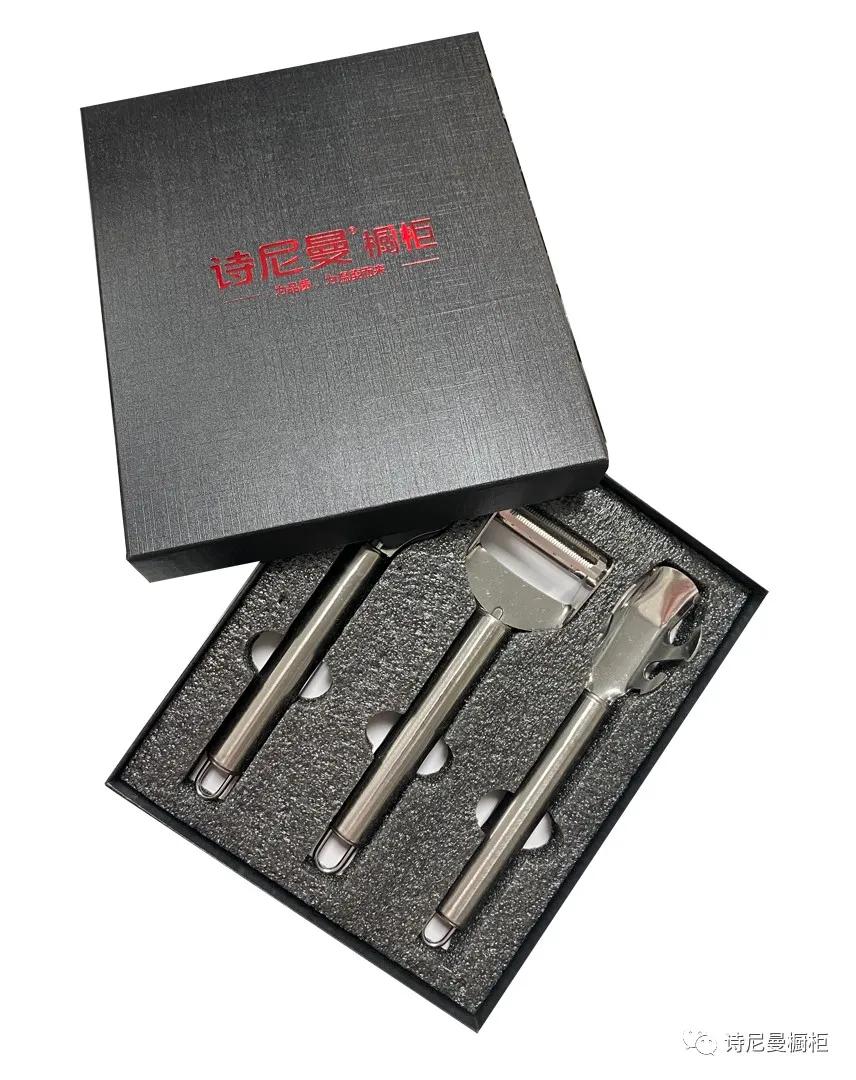 厨具三件套包括多功能开瓶器、不锈钢取碗器和刨丝刀3件。
