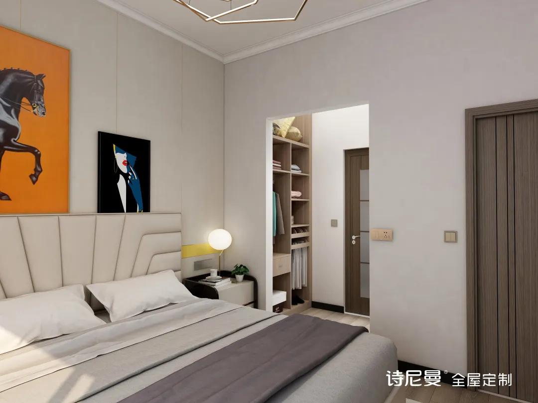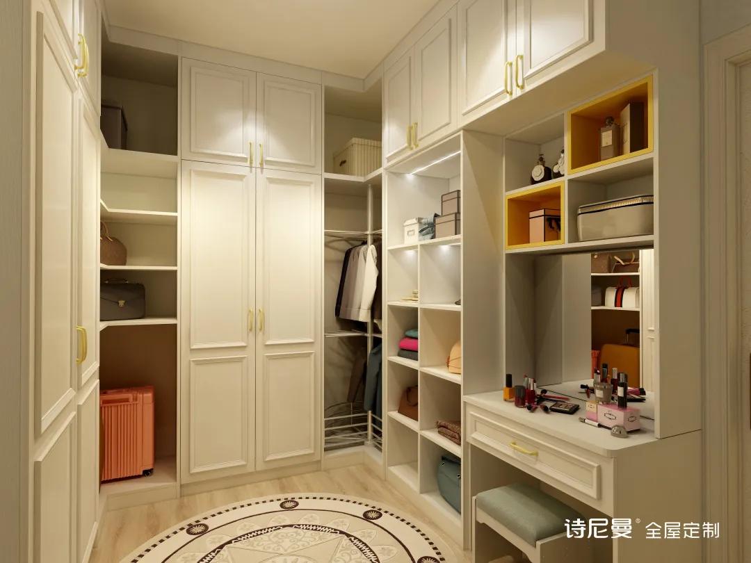 这个案例的卧室,房门旁刚好有个凹位可以设计衣帽间,方形空间大,正适合U型衣帽间。