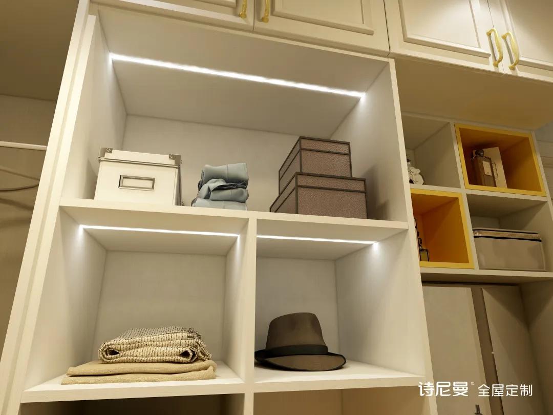 大多数衣帽间没有窗,只靠顶灯采光不够的话,可以在柜子内侧安装内嵌灯,增加室内光线,既美观又方便查找衣物。