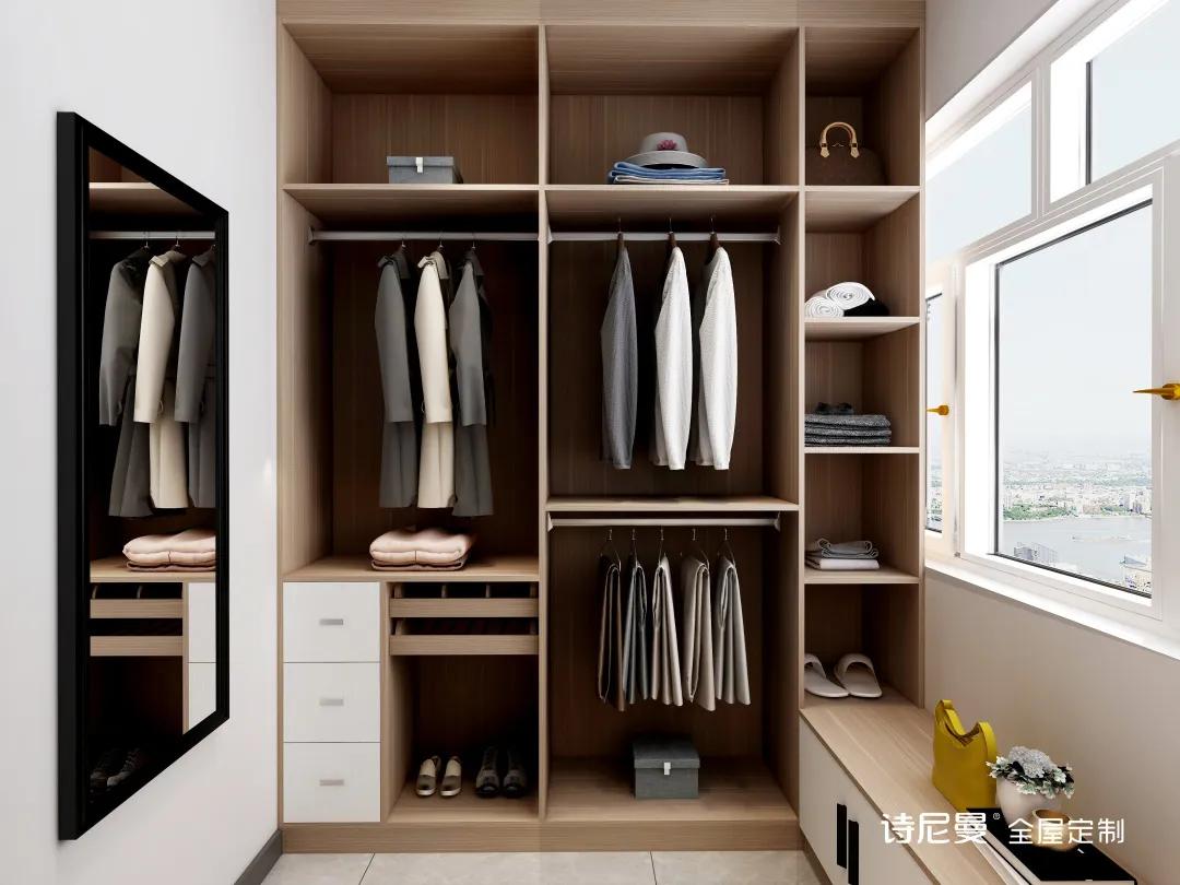 衣帽间的格局密集,本身的高柜体会显得空间比较压抑,所以不能把窗前的位置占满,阻挡自然光。