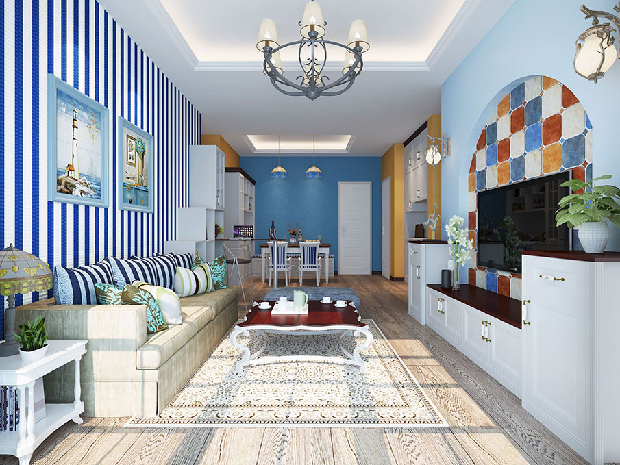 地中海风格客厅以蓝白来做为客餐厅的主色调,在视觉上给人明亮的感觉,在这样的客厅里感受蓝天白云,风光绮丽。感受习习海风,估计再这样的客厅里心情都能变成蔚蓝色的。