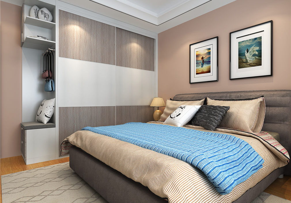 卧室里恬静的色彩给人一种温暖的感觉,衣柜置顶收纳空间利用到极致,侧边开放柜是亮点。