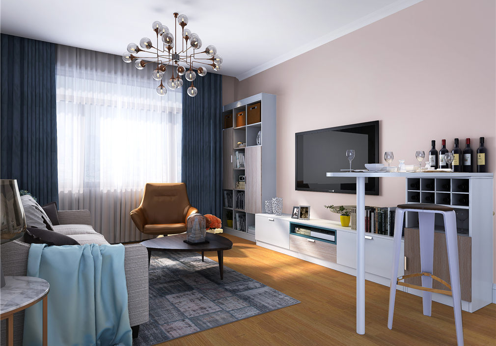 客厅墙面空间浅粉色的墙,搭配波尔多和象牙白的电视柜吧台组合柜,温馨怀旧中又蕴含大气高雅。躺椅、茶几、吧台......静享美好时光!