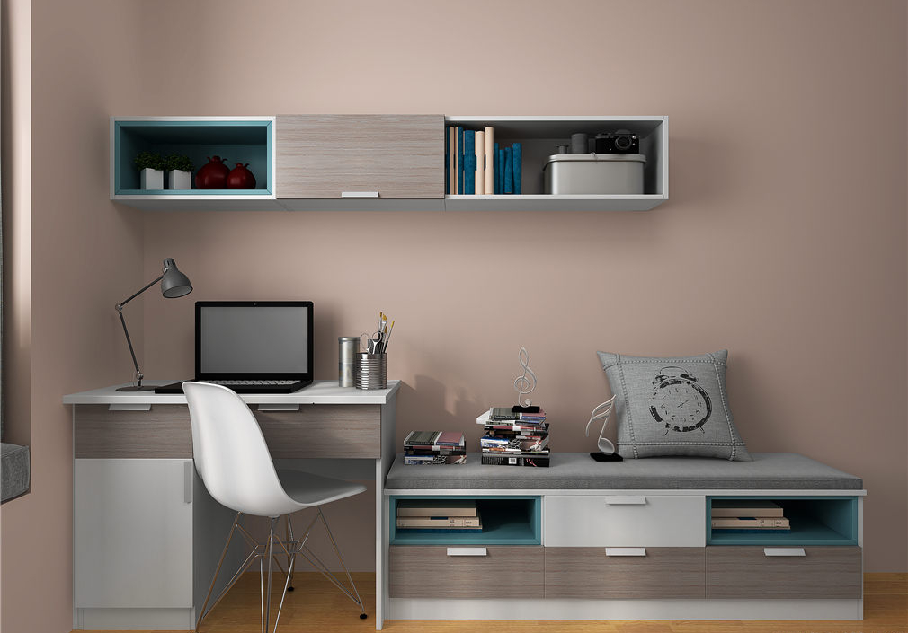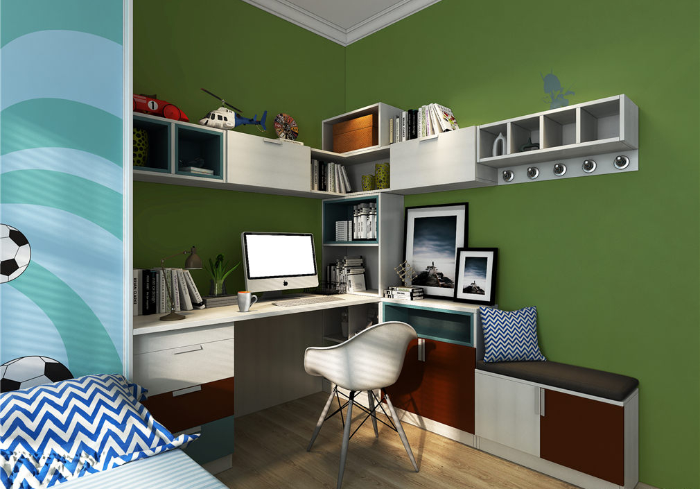 角落里的书桌和吊柜设计,在儿童房里加入一个宽敞舒适的书房学习空间,洋溢着满满的父母之爱。