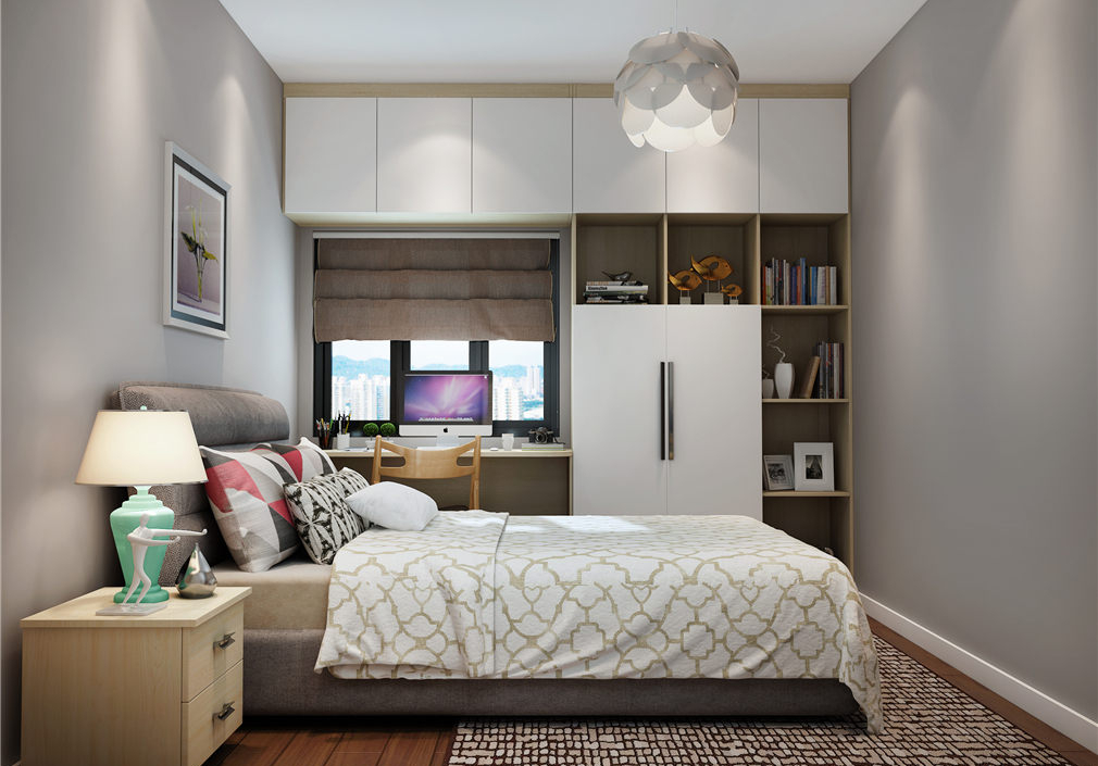 解决方案:卧室装修设计中在飘窗位设计地柜式小沙发,尺寸合适,又美观。靠窗可以呼吸新鲜空气,累了可以躺下休息,没有比这个更惬意的了。