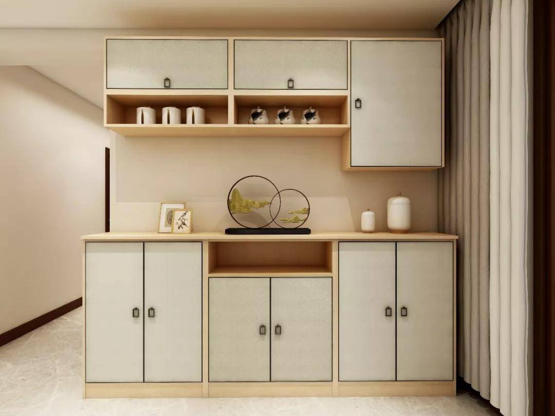 ▲上下结构式的餐边柜以简洁线条夹杂着开放式设计,丰富了墙面,优雅了餐厅。