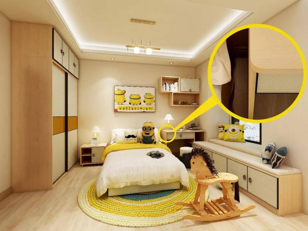 ▲儿童房衣柜配色出彩,充满童趣;组合柜面特采用圆角设计,给予家长和孩子更多安全感。