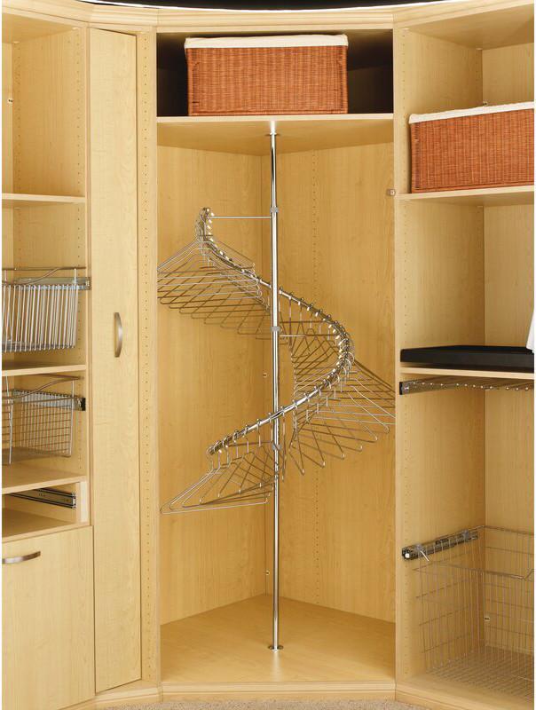 在衣帽间拐角处设计安装一个旋转挂衣架,是巧妙利用拐角空间,提高衣物收纳能力的方法之一。这种能360°旋转的挂衣架通过螺旋式设计加长了挂杆的整体长度,让挂衣量翻倍,开放式的旋转挂衣方式非常灵活,挂取衣物更方便实用。但由于挂衣量大,整体挂架及五金配件必须选用优质材料制作,确保牢固和稳定性,做到美观耐用。