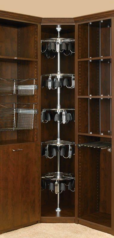 在衣帽间拐角处安装一个旋转鞋架也是巧用拐角空间收纳的一种形式,不但节省空间,还可以提高鞋子的收纳能力,各类精致的鞋子挂在360°旋转鞋架上,既是一种收纳形式,也是一种展示女人底气和自信的形式,让衣帽间更有格调。但由于这种金属材质的通顶多层旋转鞋架自身比较重,一定要安装牢固,旋转灵活,方便随时拿取所用鞋子。
