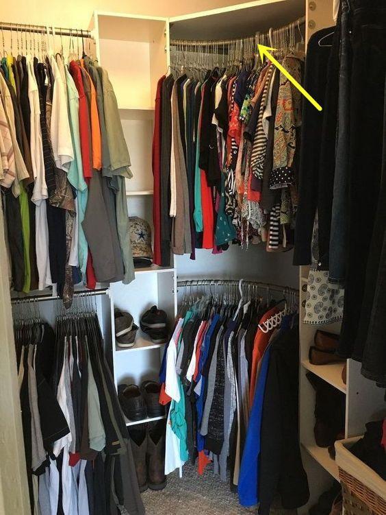 弧形挂衣杆相比较旋转挂衣架设计更简便,实用,也是通过弧形设计延伸挂杆的长度,这样可以比普通平直挂杆收纳衣物更多,能力翻倍。弧形挂衣杆一般采用上下两层式设计,开放式衣物收纳让要取的衣物一目了然,随手拿取十分方便。而且这种形式安装简单省钱,与整体的收纳形式保持统一。