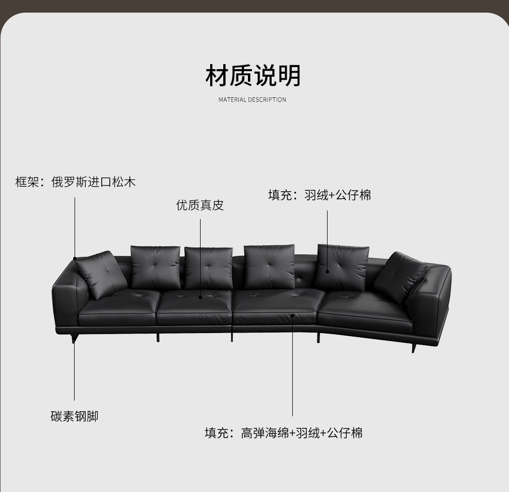 迪兰SF-P2564F意式极简真皮沙发 三人位左扶手+异型贵妃位右扶手
