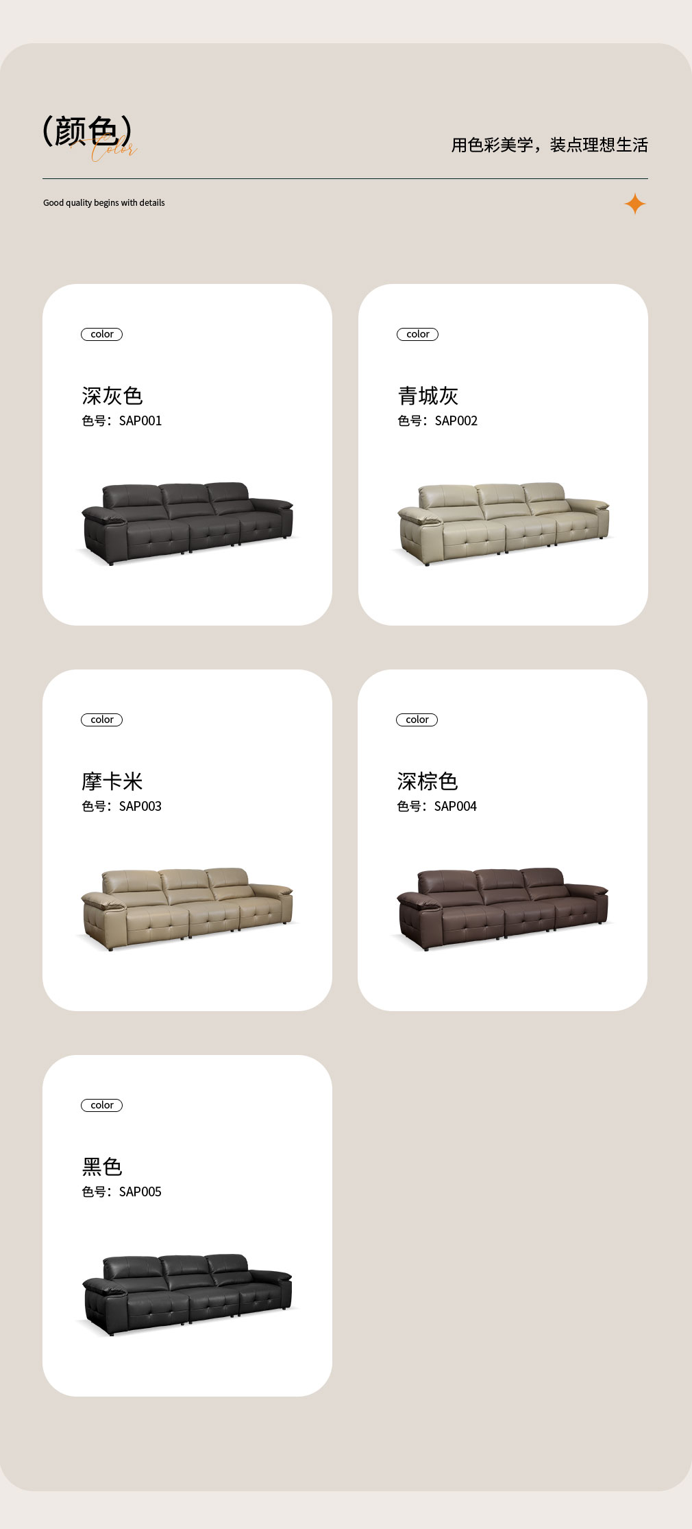 SAP005黑色 SAP004深棕色 SAP003摩卡米 SAP002青城灰 SAP001深灰色