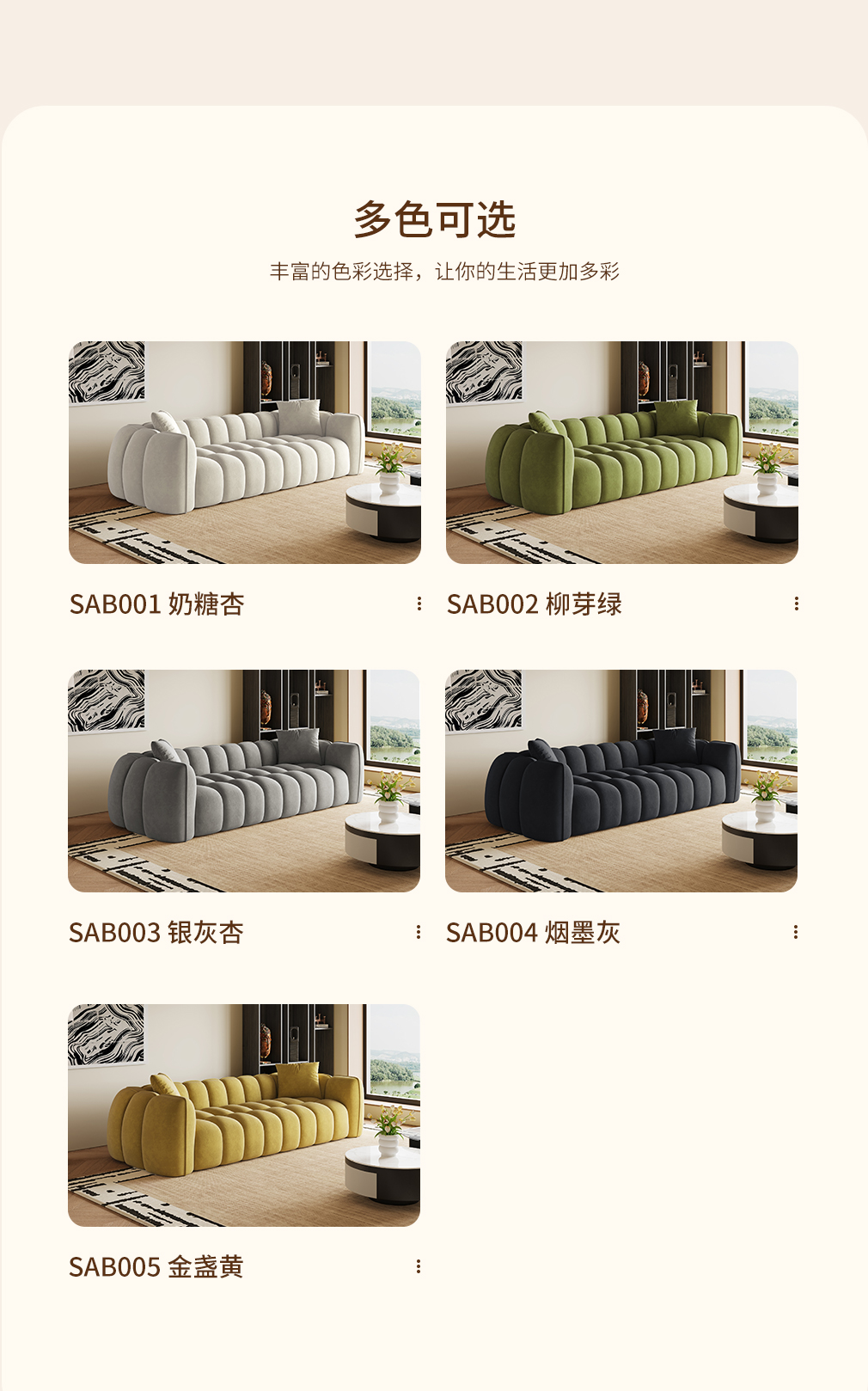 SAB005金盏黄 SAB004烟墨灰 SAB003银灰杏 SAB002柳芽绿 SAB001奶糖杏