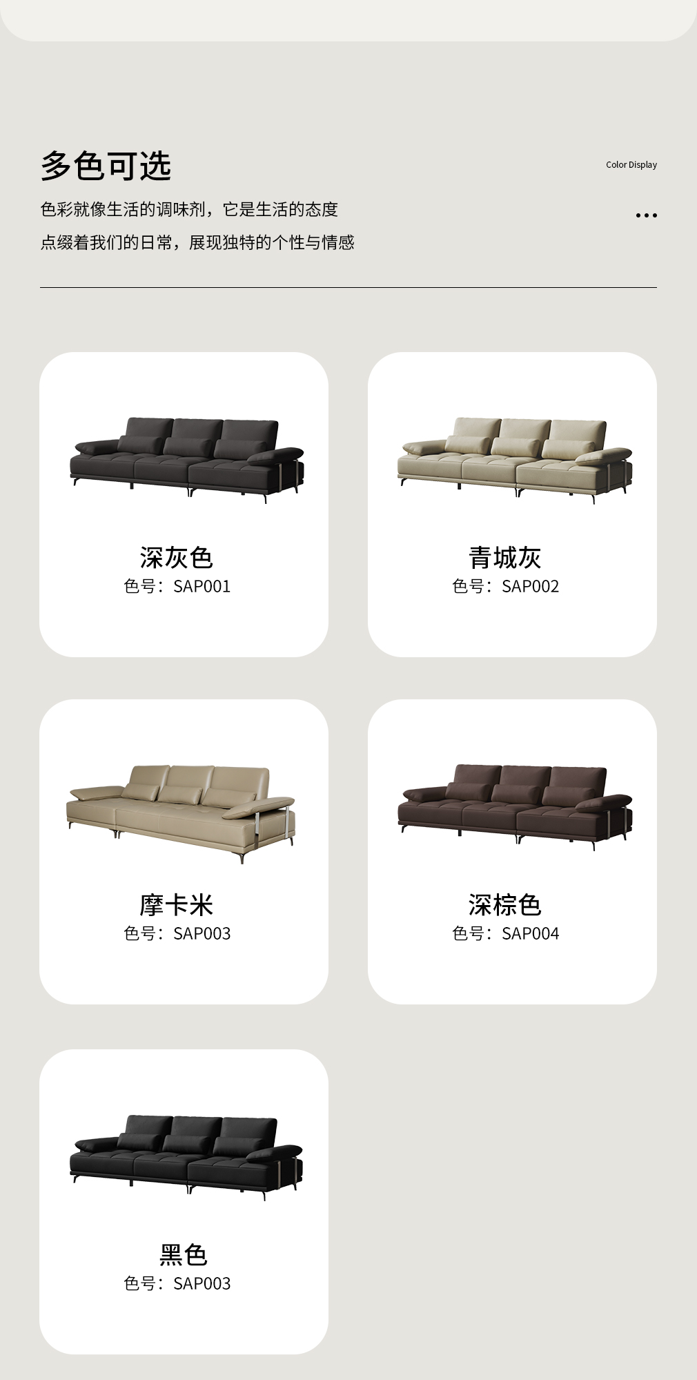 SAP005黑色 SAP004深棕色 SAP003摩卡米 SAP002青城灰 SAP001深灰色